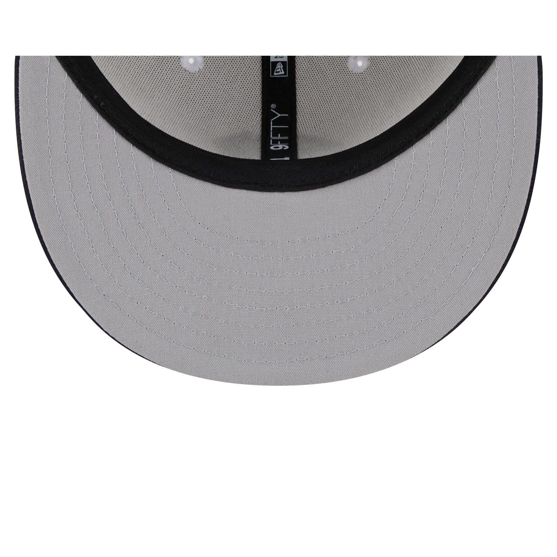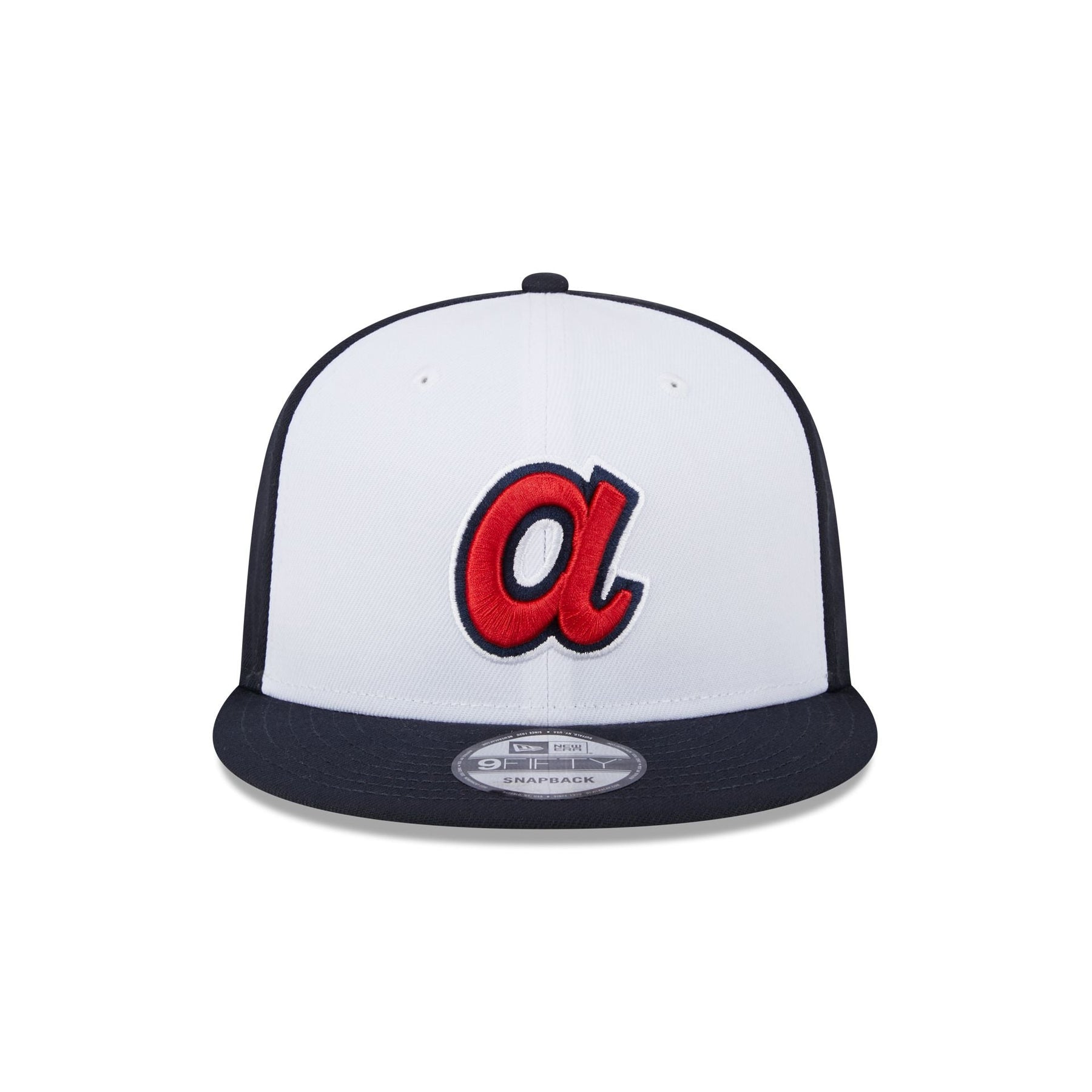 The Atlanta Braves 2025 Batting Practice 9FIFTY Snapback features an embroidered Braves logo at the front panels with a matching snapback closure at the rear. Additional details include a pivot knit fabrication, a navy visor, and a gray undervisor.