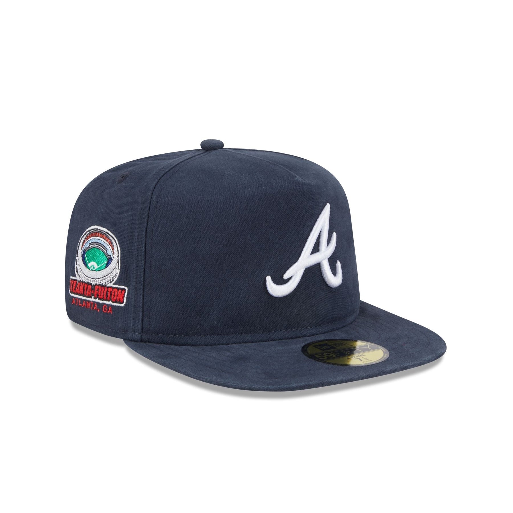 The Atlanta Braves Side Flag 59FIFTY A-Frame Fitted Cap features an embroidered Braves logo at the front panels with a matching MLB Batterman logo at the rear. Additional details include a Atlanta-Fulton patch at the right-wear side, a team flag pin at the left-wear side, and a gray undervisor.