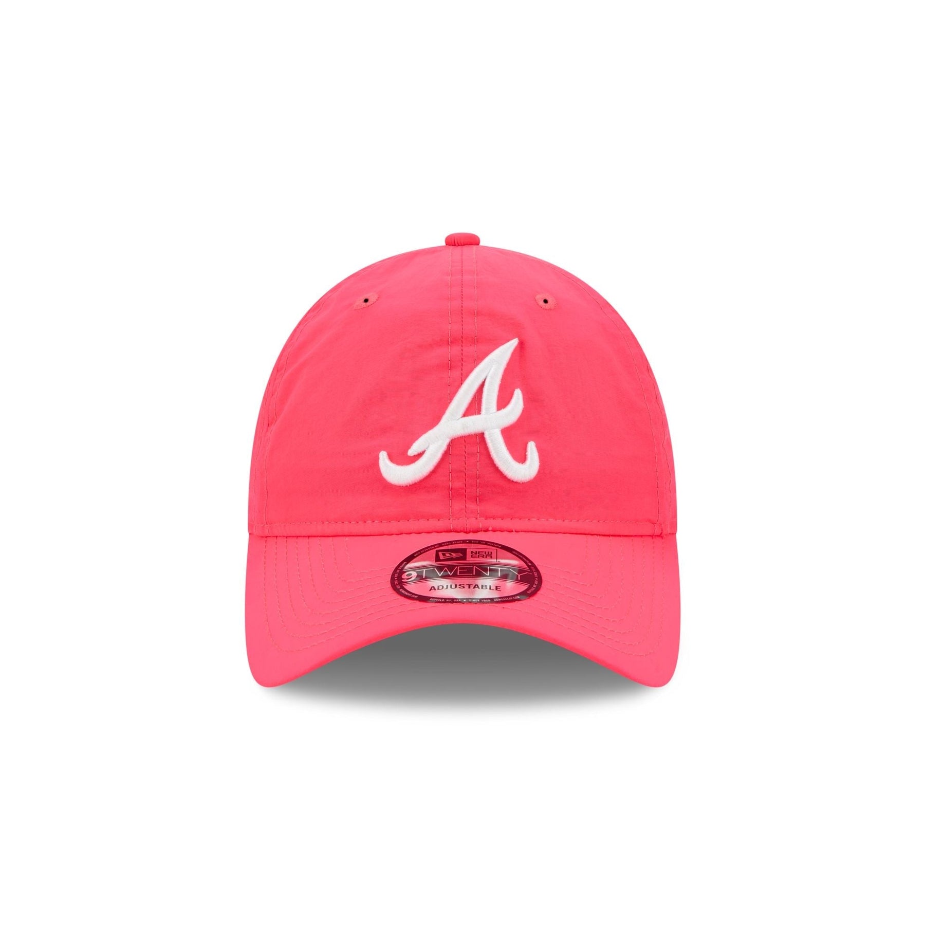 The Atlanta Braves Everyday Nylon Pink 9TWENTY Adjustable Cap features an embroidered Braves logo at the front panels with an adjustable strapback closure at the rear and a gray undervisor.