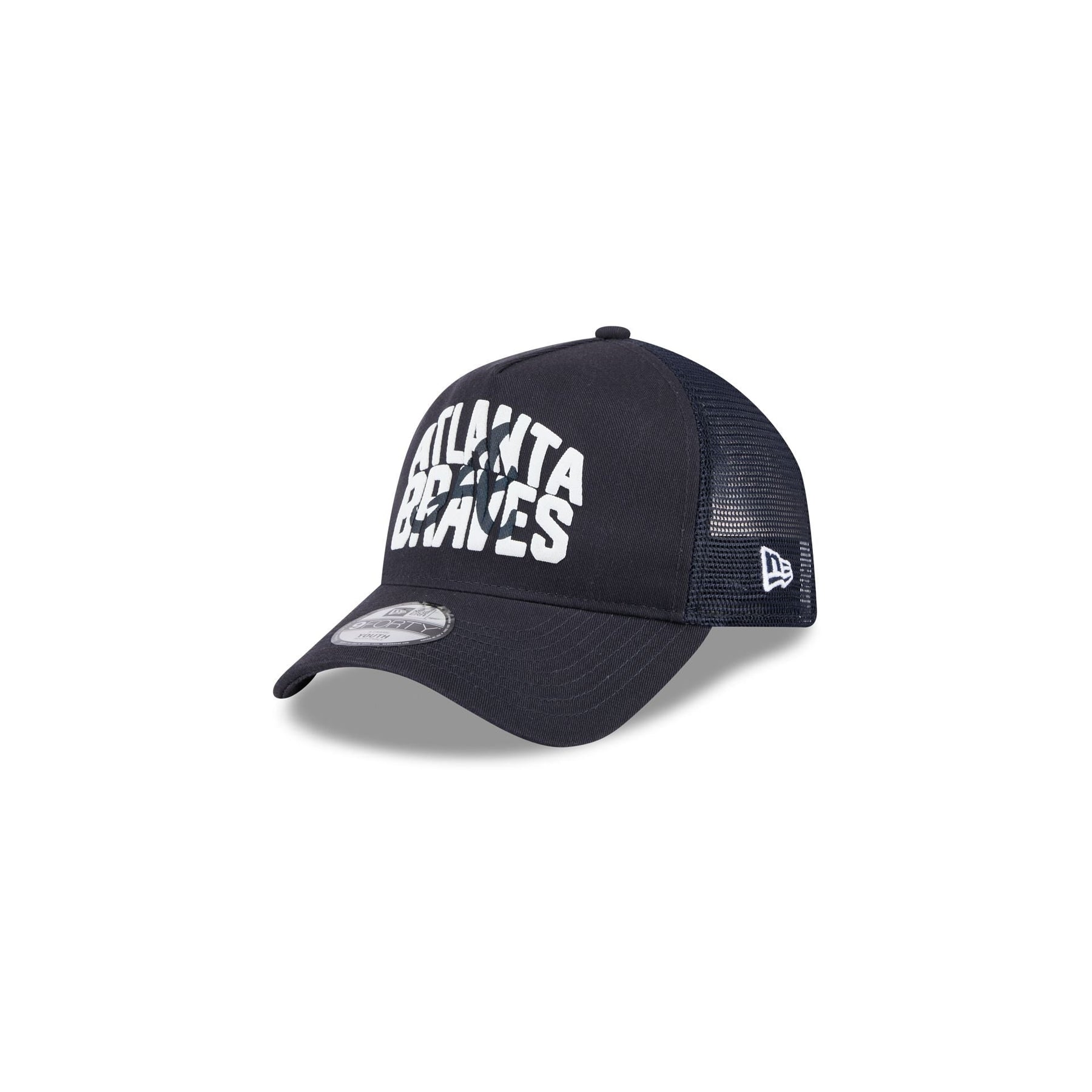 The Atlanta Braves Kids Chalk 9FORTY A-Frame Trucker features a puff screen-printed Braves wordmark and logo at the front panels with a team tag on a snapback closure at a mesh rear.