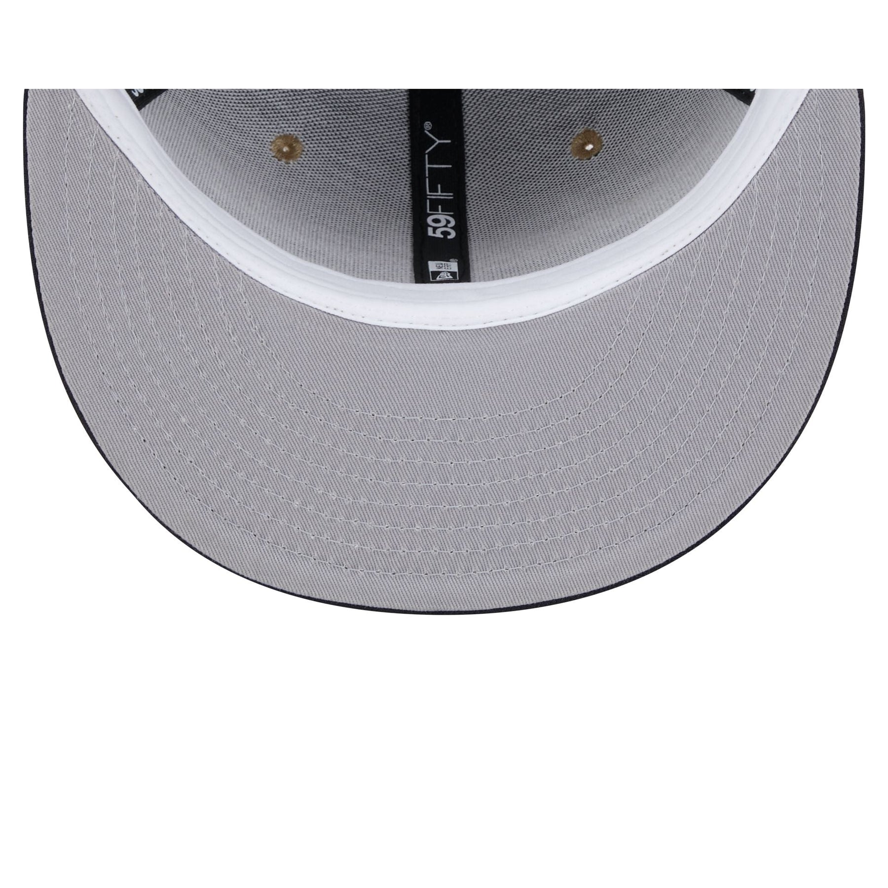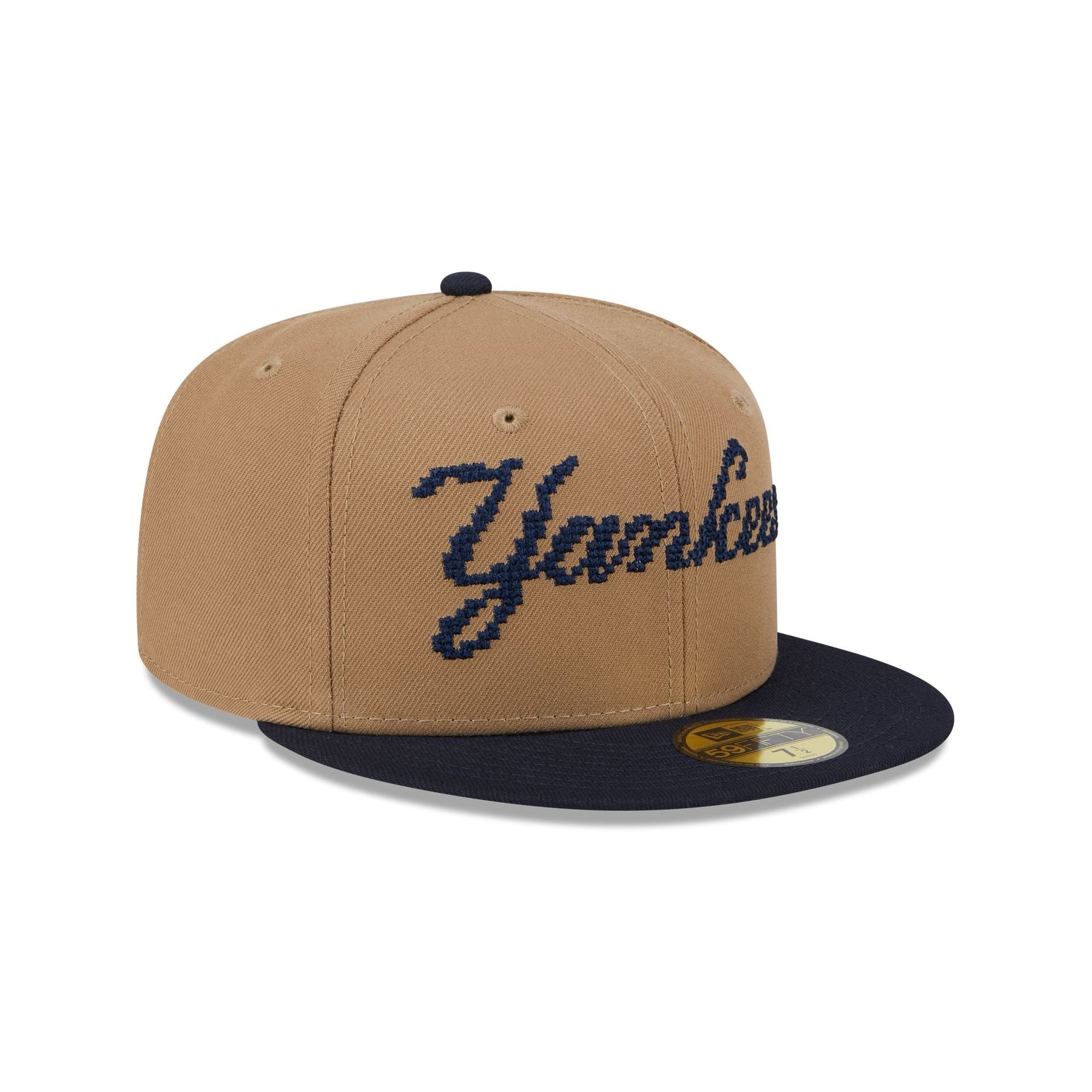 The New York Yankees Classic 8-Bit Wordmark 59FIFTY Fitted Cap featured an embroidered Yankees 8-bit stitch wordmark at the front panels. Additional details include a team wordmark with a matching MLB Batterman logo at the rear and a gray undervisor.