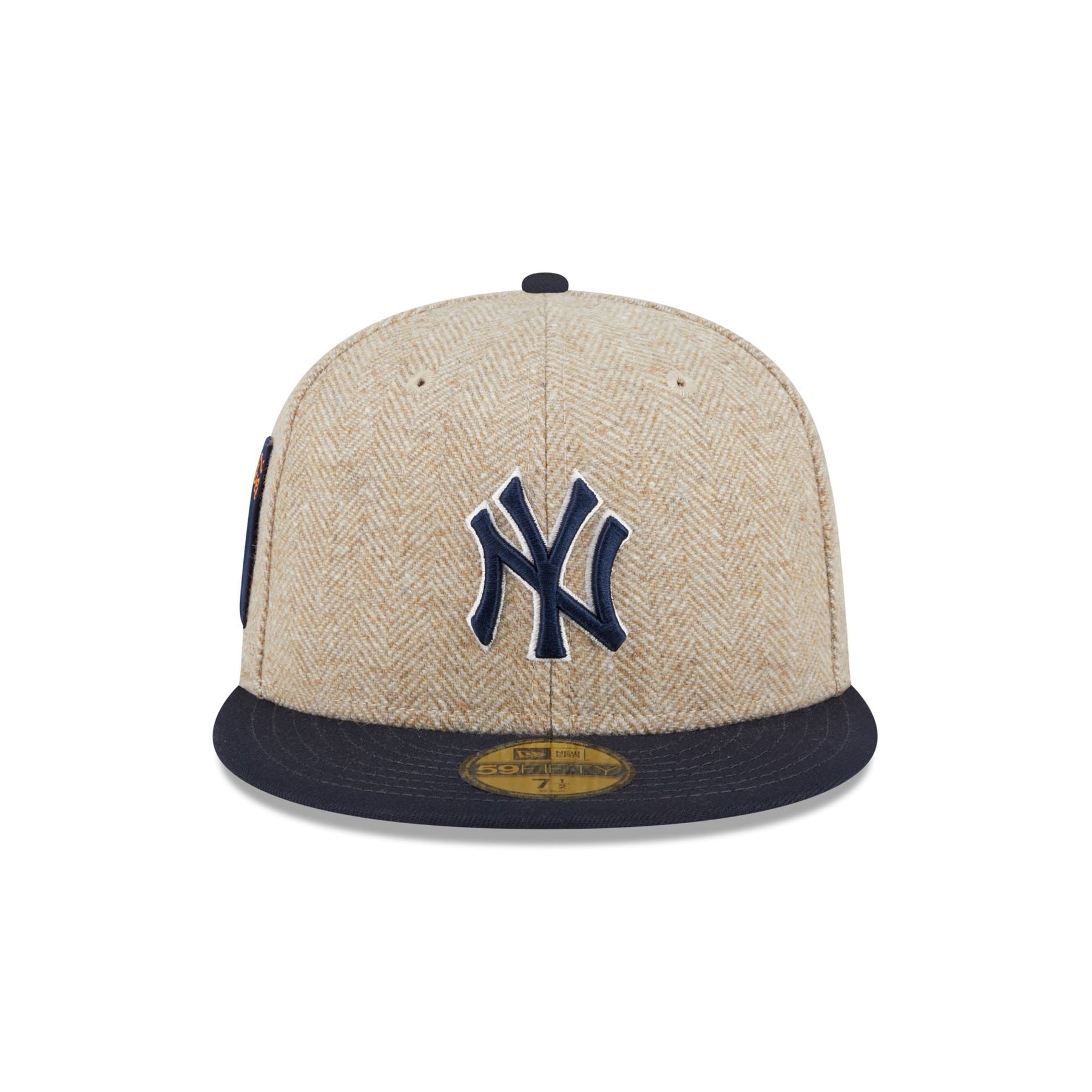 The New York Yankees Herringbone Moon 59FIFTY Fitted Cap features an embroidered Yankees logo at the front panels against a Moon tweed fabrication throughout and a MLB Batterman at the rear. Additional details include a woven Yorkshire Moon Tweed tag at the right-wear side and a gray undervisor.